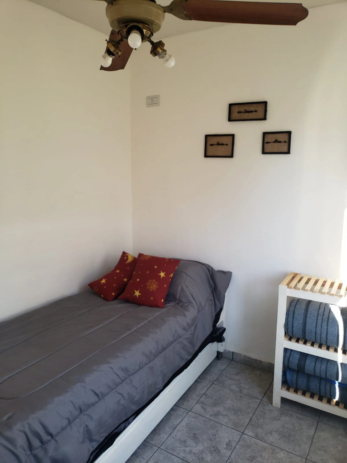 Tiene capacidad para hasta 4/5 personas. Cuenta con una habitación con cama de 2 plazas con ventilador de techo, otra habitación con cama Cucheta y ventilador de pie, un baño. Cocina con Anafe Eléctrico, Horno Eléctrico, Pava Eléctrica, Vajilla Completa. Living Comedor con Mesa y sillas para 5 personas, con Sofá/Cama, Tv Smart 32", Aire Acondicionado Frio/Calor, Wifi.